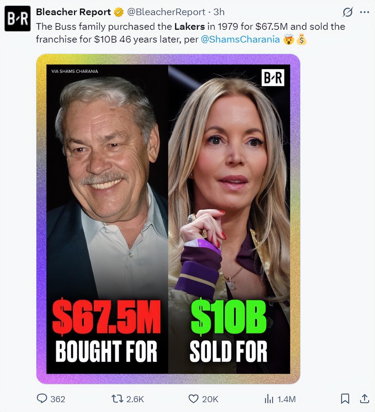 答案就是马克-沃尔特给出的太多了,1979年杰里-巴斯是用6750万购入湖人,46年后珍妮-巴斯以100亿出售湖人,而且巴斯还留了15%的股权,每一年她们巴斯家族还是能获得分红,这笔买卖巴斯家族是稳赚不赔。