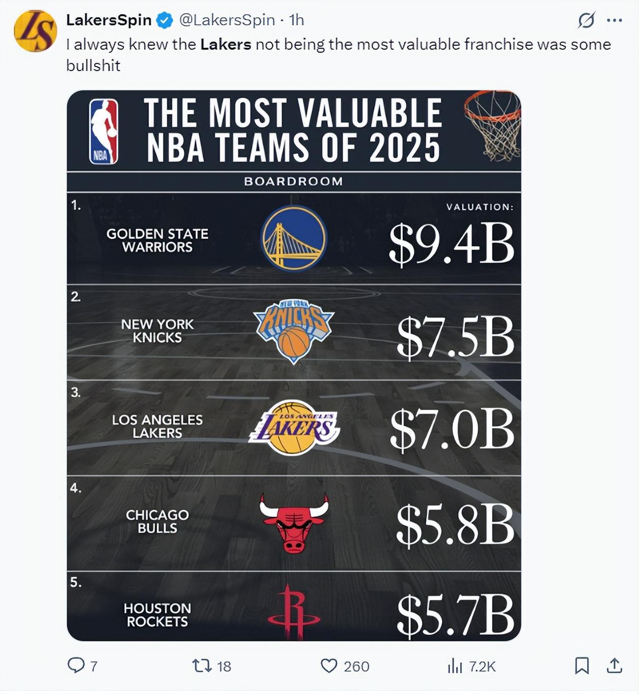 湖媒:看到了吧,那些说什么湖人不是NBA最具价值的消息都是虚假的,你们不是说湖人是市值第三的球队吗?