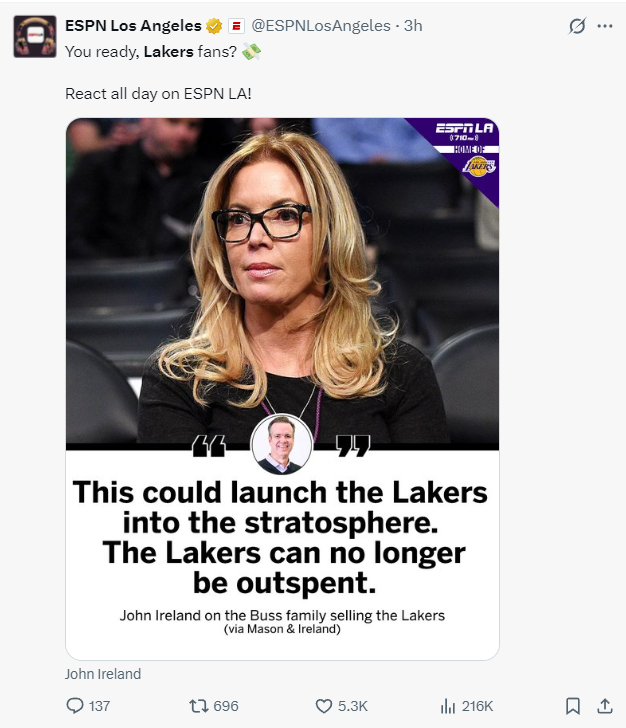 根据ESPN的消息,本次的交易是纯商业品牌的转手,因为洛杉矶湖人队是一支连球馆都没有的球队,而且就算马克-沃尔特没有优先购买权,巴斯家族让湖人上拍卖货架,湖人也能卖100亿美元,湖人的商业品牌价值就是这么恐怖。